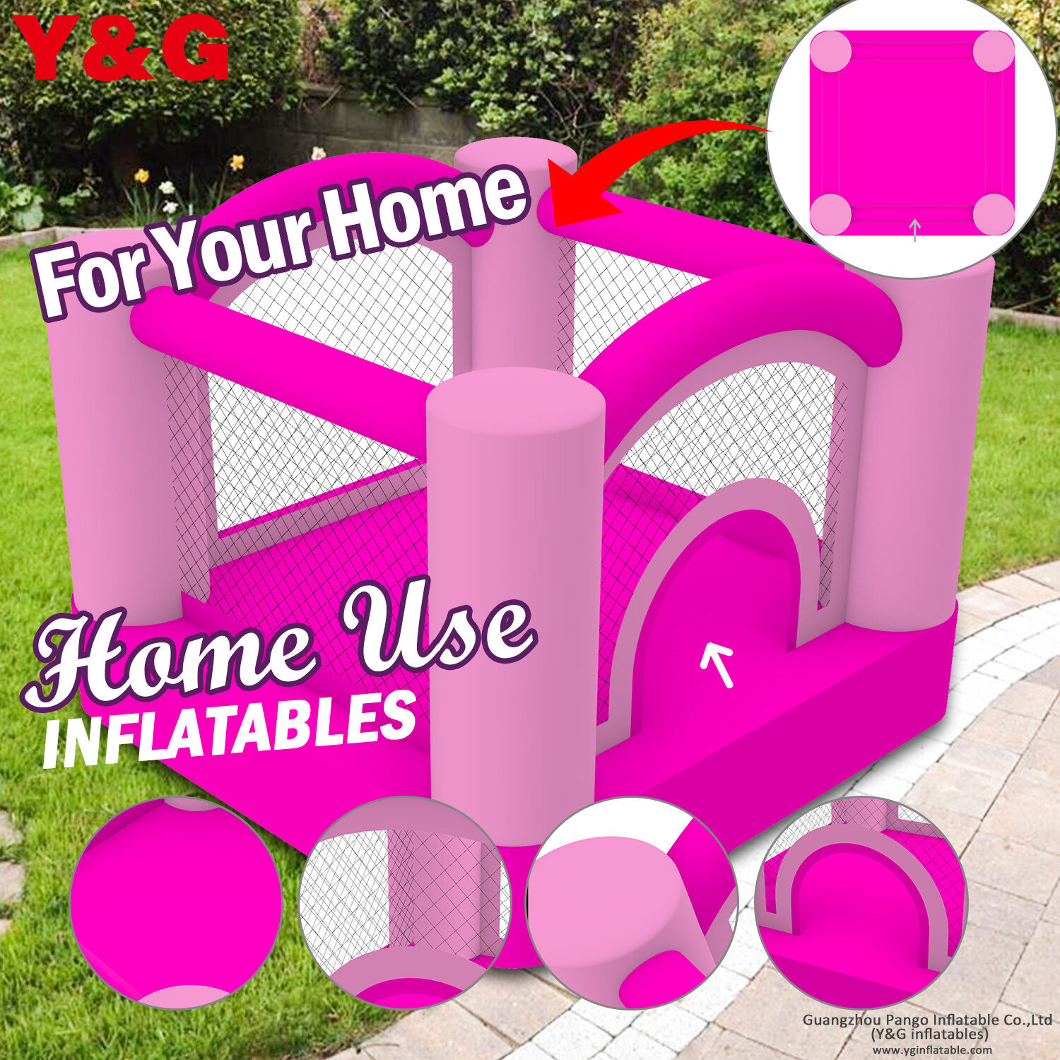 01. All jumping area use the 0.4mm 840D thicker PVC tarpaulin, is more durable and can be used for a long time.02. All the inside joint “I beam” fabric use 190t nylon material, the tensile force is over 180 pounds. Provide a durable bouncing performance.03. To ensure customer’s health, all materials Y&G used conform to European and American standards, and even better than the standard. Also, each product is tested carefully to confirm that they 100% meet the entire Consumer Product Safety Information Act (CPSIA), including phthalates and lead content in both surface coatings and structures.