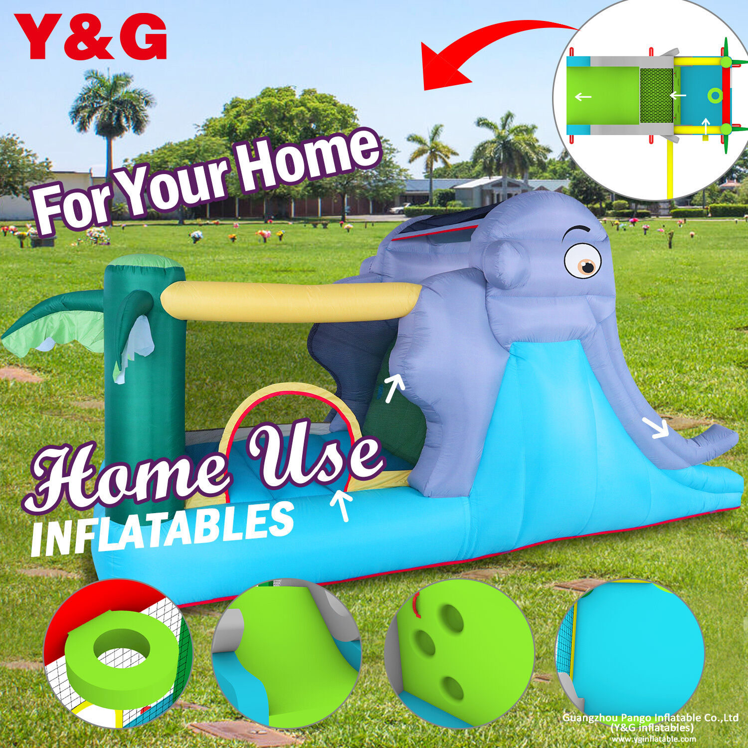01. All jumping area use the 0.4mm 840D thicker PVC tarpaulin, is more durable and can be used for a long time.02. All the inside joint “I beam” fabric use 190t nylon material, the tensile force is over 180 pounds. Provide a durable bouncing performance.03. To ensure customer’s health, all materials Y&G used conform to European and American standards, and even better than the standard. Also, each product is tested carefully to confirm that they 100% meet the entire Consumer Product Safety Information Act (CPSIA), including phthalates and lead content in both surface coatings and structures.